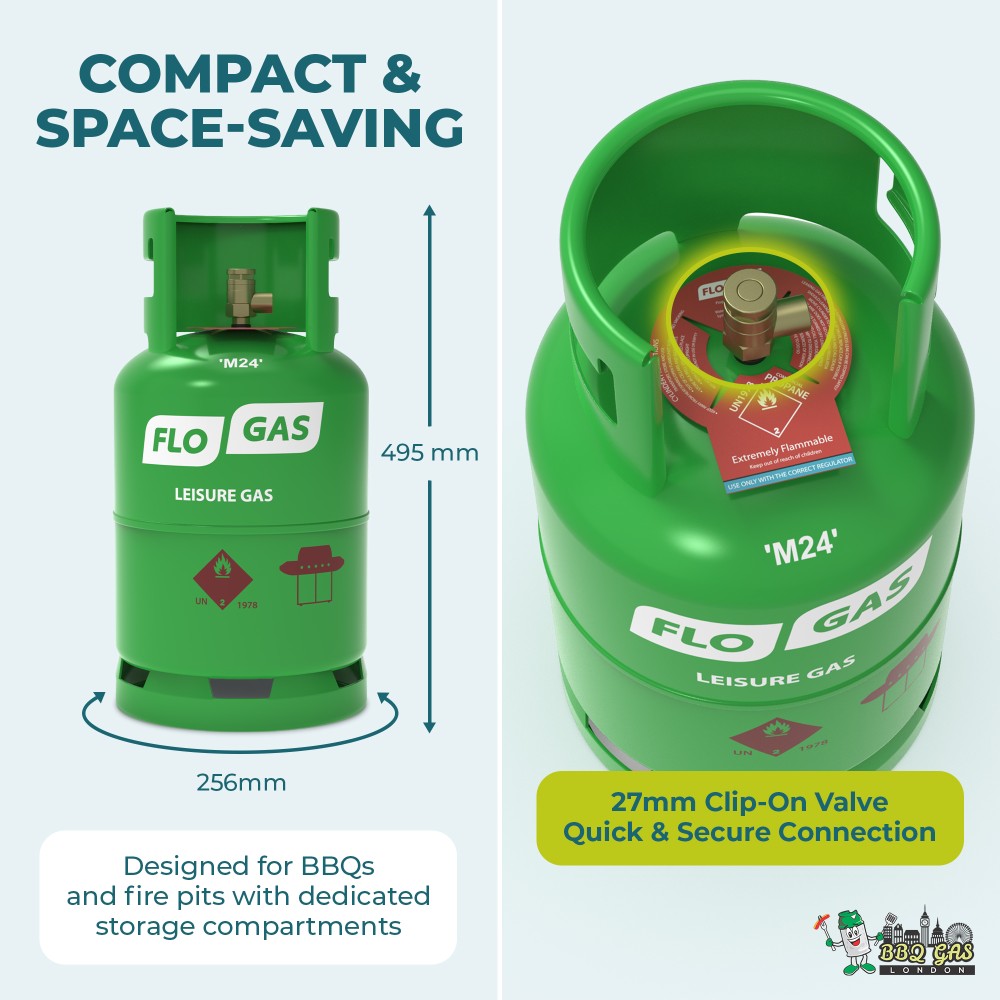 Size: 6 kg LPG (propane) Brand:Flogas Ideal for: Small BBQs, camping stoves, patio heaters, leisure appliances Connection: 27 mm clip-on regulator (always check your appliance)
