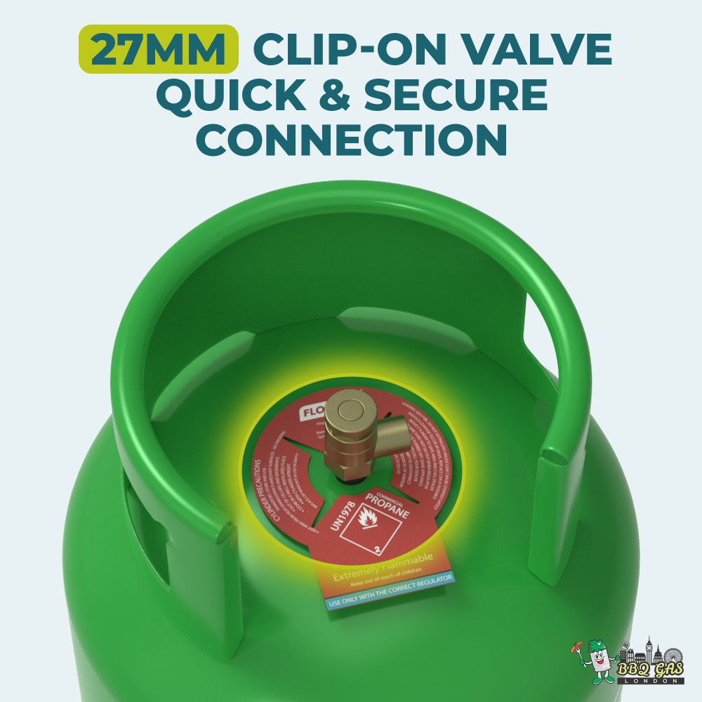 Size: 11 kg LPG (propane) bottle Brand:Flogas Ideal for: Outdoor catering, events, leisure appliances, large BBQs Connection: 27 mm clip-on regulator (always check your appliance)