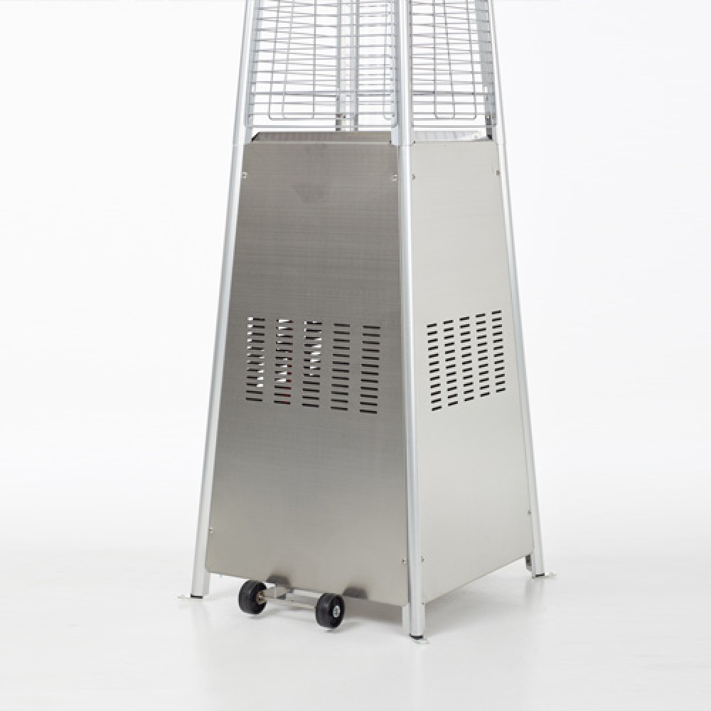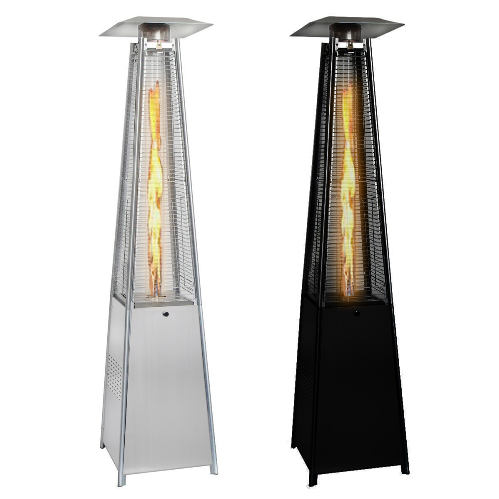 - Available is different options: you can buy the pyramid patio heater in black gloss, stainless steel or grey rattan edition